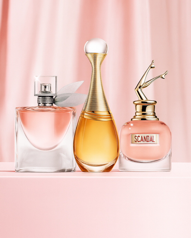 Combo de 3 perfumes Jean Paul Gaultier SCANDAL, Dior J'ADORE e Lancôme LA VIE EST BELLE 100ml